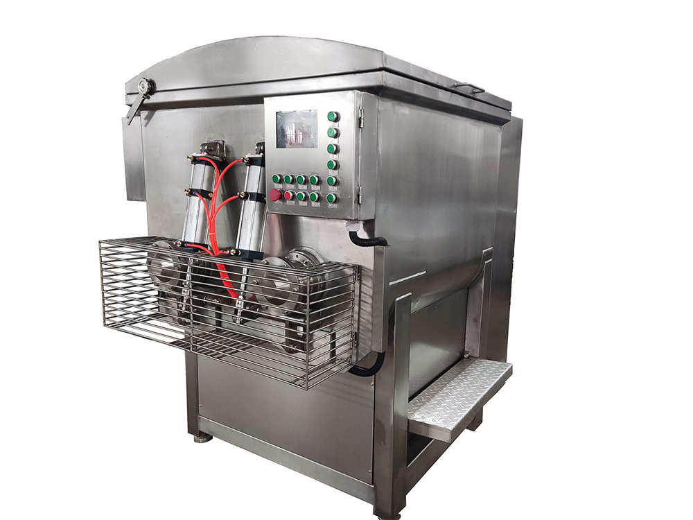 →雙軸雙速拌餡機  →型號 150/350/600/1200升  →功能  適合各種餃子、包子等肉類及蔬菜類餡料的攪拌  →特色  1、采用平行雙軸結構,螺旋板式槳葉,物料在料斗中翻動的同時作圓周運動,同時完成軸向回流,使各種物料攪拌的更加均勻。  2、采用雙速雙動力,根據所拌餡的種類及工藝選擇不同的轉速和不同的運轉方式進行攪拌。  3、上蓋后端設有行程開關,根據上蓋的開合,自動切斷或接通電源,操作方便,安全可靠。  4、整機采用不銹鋼制造,易于清洗,美觀大方。符合國家衛生標準。  5、可根據客戶的需求定制自動進水,自動起蓋,自動排料等功能。  →主要技術參數產品型號面斗容積(L)額定功率(kw)攪拌轉速(rpm)額定電壓(v)外形尺寸(長×寬×高)SZJ   150升1501.5/2.442/84380920×665×990SZJ   350升3502.2/3.342/843801180×880×1390SZJ   600升6003.0/4.542/843801430×1080×1590SZJ  1200升12005.0/7.542/843801600×1530×2750